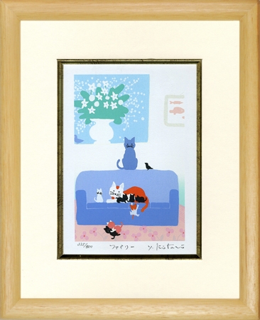 ソファーの上のネコの描かれた作品です。