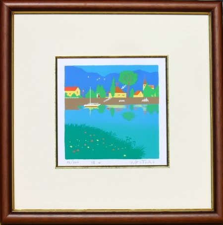 川岸の家とヨットの描かれた作品です。