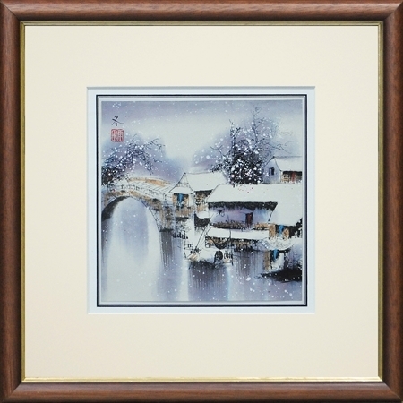 雪の水辺の橋と家の描かれた作品です。