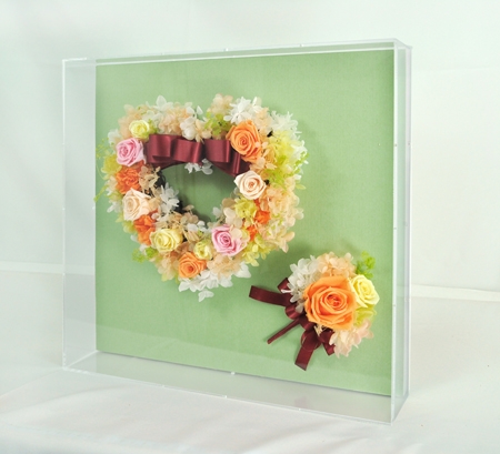 アクリルBOXに入った、プリザーブドフラワーの作品です。