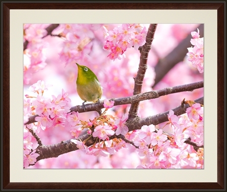 Foto.Q 満開の桜の枝に止まるメジロ